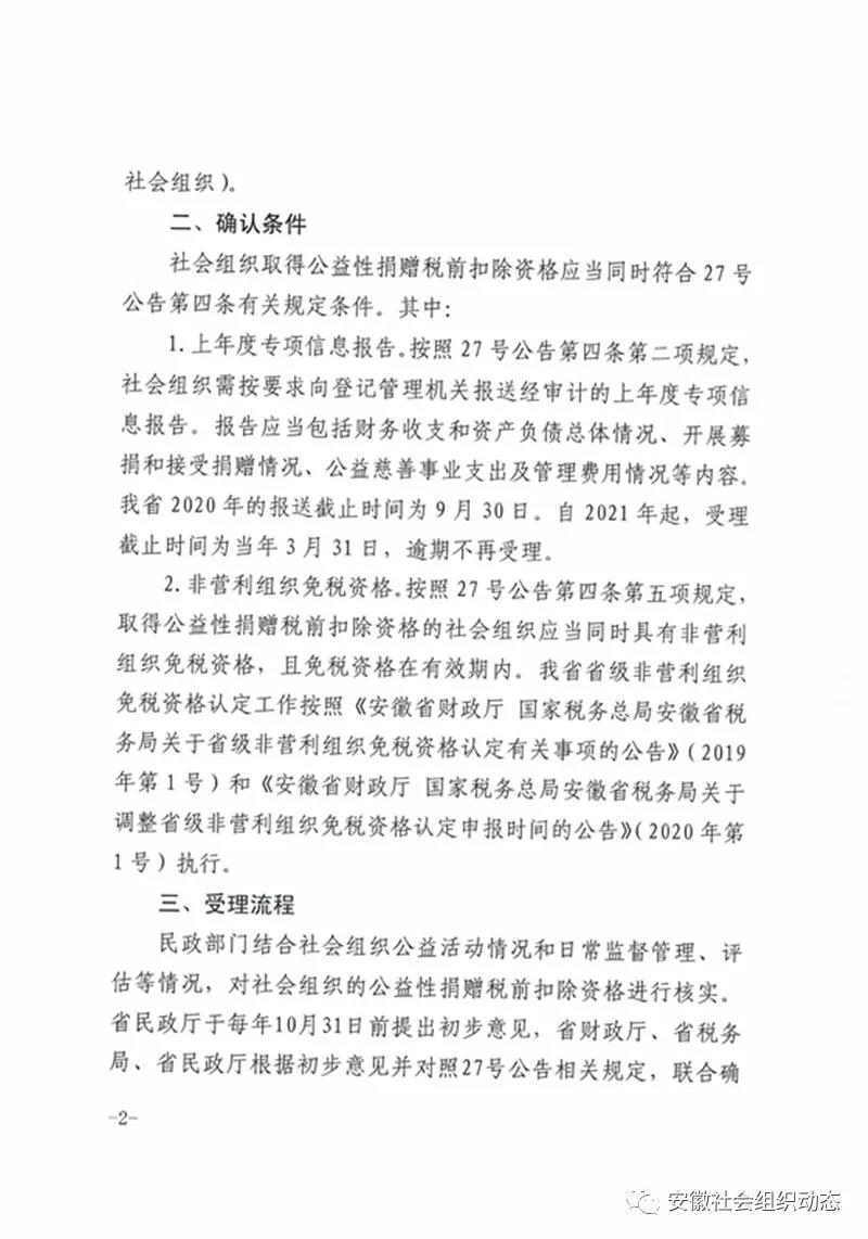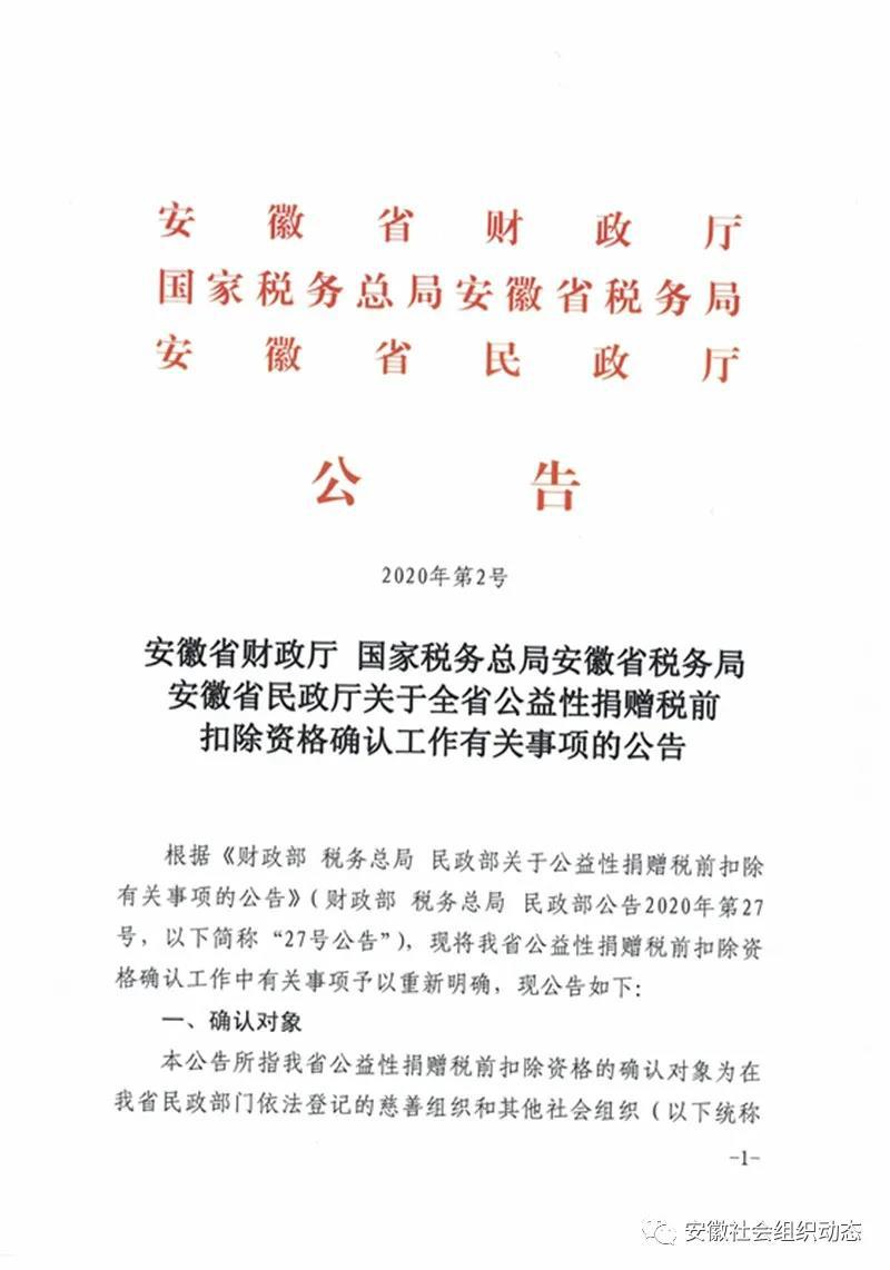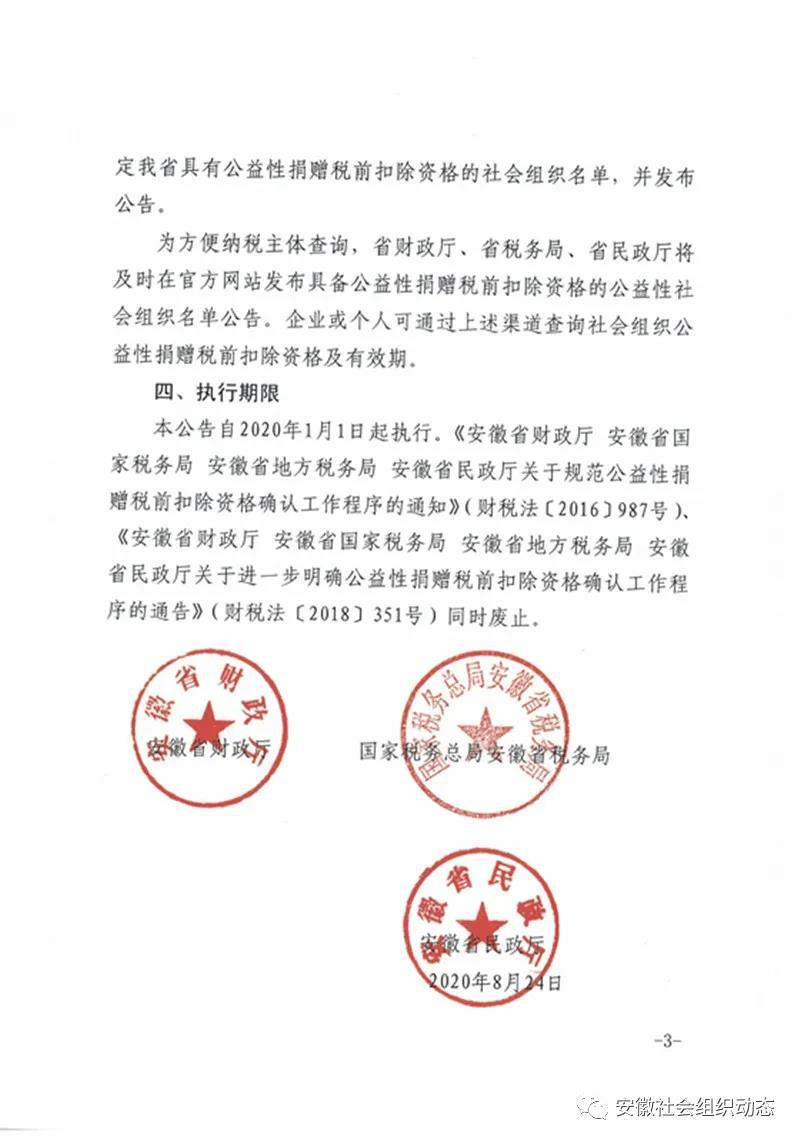 安徽省财政厅 国家税务总局安徽省税务局 安徽省民政厅关于全省公益性捐赠税前扣除资格确认工作有关事项的公告