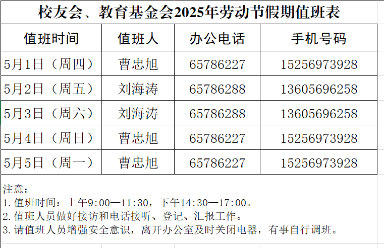 校友会、教育基金会2025年劳动节假期值班表