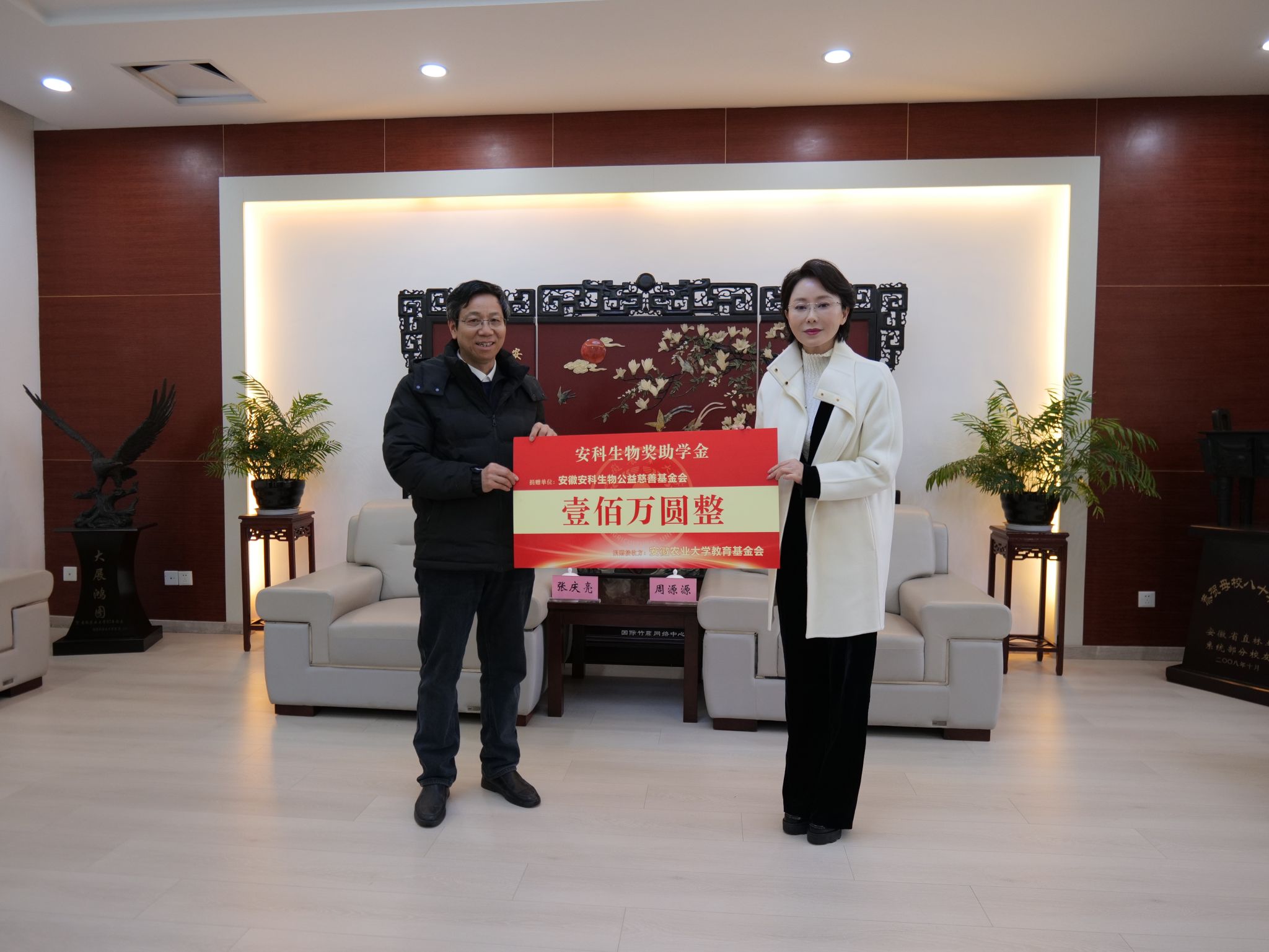周源源介绍了安科生物公益慈善基金会的基本情况和发展历程。她表示,安科生物始终关注和支持教育事业的发展,此次在安徽农业大学设立奖助学金,旨在激励广大学子勤奋学习、勇于创新,助力家庭经济困难学生顺利完成学业。希望双方加强沟通协作,共同把这项惠及学子的事业做好做实,为培养更多优秀人才贡献力量。